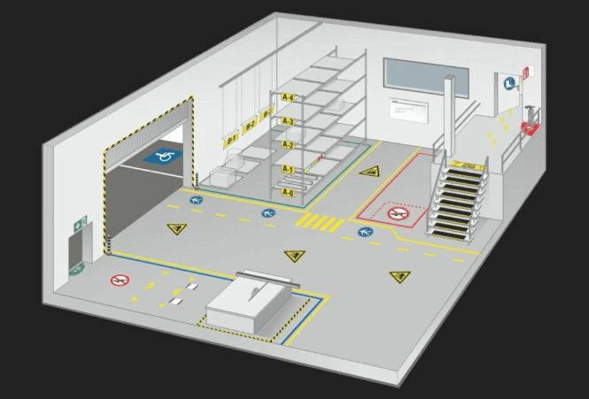 Hallenmarkierungen dienen dazu, Arbeitszonen, Verkehrswege, Sperrflächen und